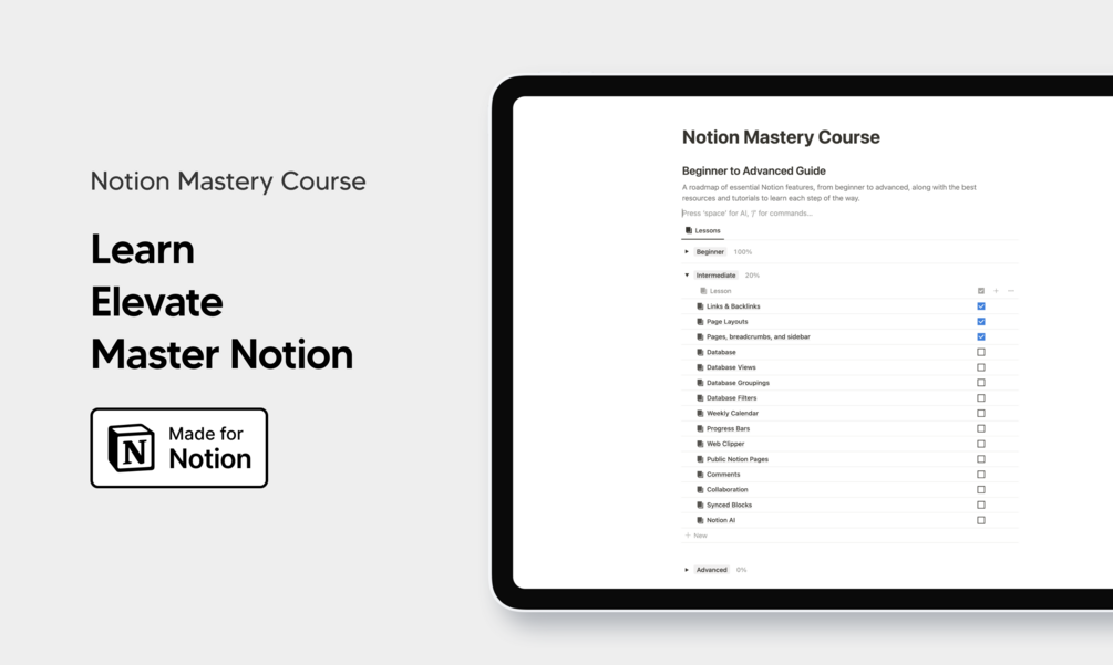 Designed entirely within Notion itself, this comprehensive course offers you the freedom to elevate your Notion skills at your own pace, anytime, anywhere. Whether you're a beginner seeking to navigate the basics or an advanced user aiming to unlock new capabilities, our course has something for everyone.
